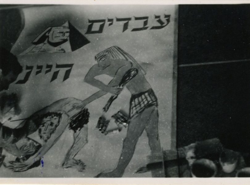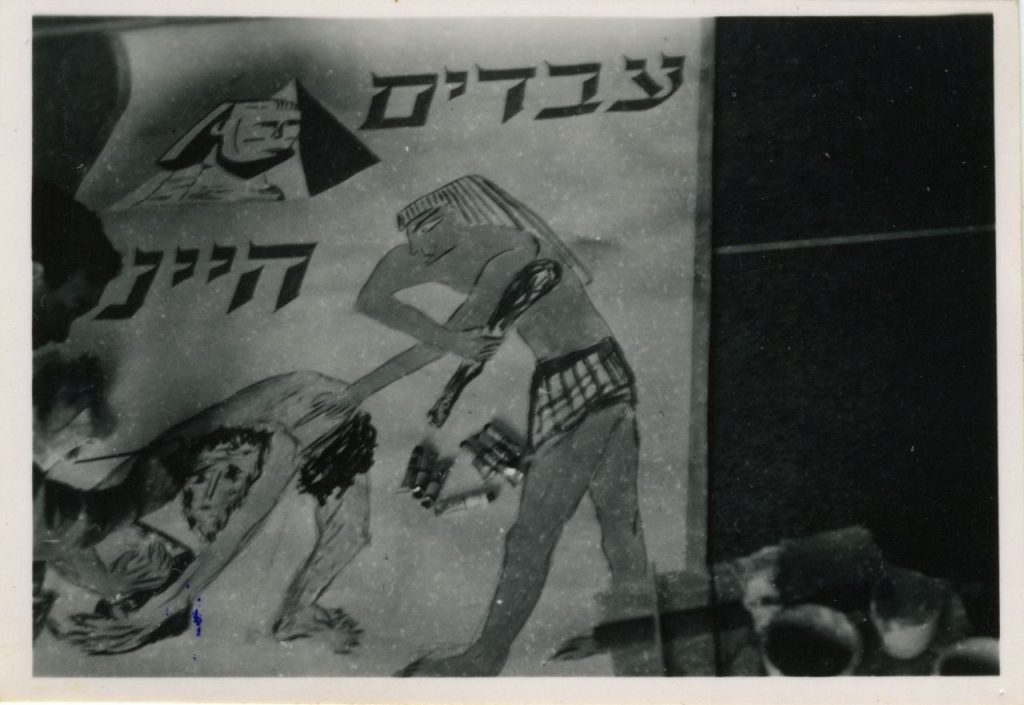תמונה משנות ה־40: על קיר מבנה ברומא, בירת איטליה, כתוב הפסוק המפורסם 'עבדים היינו, עתה – בני חורין.' המילים מלוות באיורים של מצרי נוגש בעברי ליד הפירמידות, ולעומתו דגל ישראל מתנוסס על מפת המדינה. נסיבות הציור סוגרות מעגלים מרגשים של חירות ועול, של ישראל ומצרים, של יציאה נסית וחציית ים.