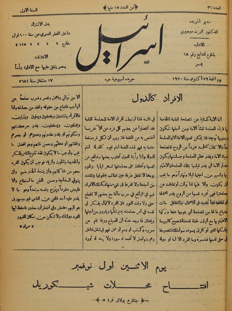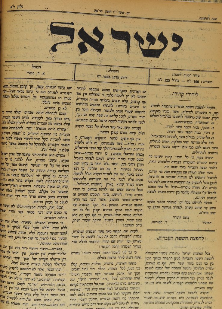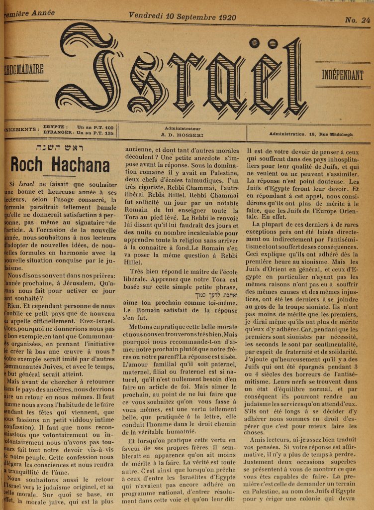 השבועון 'ישראל', נתן במה לקהילה היהודית בקהיר, אך מעבר לכך שימש כלי לחינוך ולתעמולה ציונית במצרים ומחוצה לה. הוא הופיע לראשונה בפסח תר"פ (2.4.1920) בשלוש שפות שפעלו מתוך שלוש מערכות עצמאיות: "ISRAEL" – בצרפתית, "אסראאיל" – בערבית ו"ישראל" – בעברית. המהדורה הצרפתית, שערך אלברט, נחשבה לראשית והיא יועדה בעיקר לבורגנות היהודית המשכילה, שהושפעה מתרבות המערב ושלטה בשפה. המהדורה הערבית פנתה ליהודים דוברי הערבית במצרים ובמזרח התיכון, ושימשה כלי הסברה ציוני עבור האוכלוסייה הערבית. המהדורה העברית, נועדה לקחת חלק במאבק הציוני להחייאת השפה ולהפיכתה מלשון קודש לשפת דיבור יומיומית.